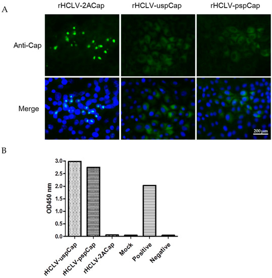 To determine the expression of the Cap protein of the recombinant viruses, SK6 cells were infected with each recombinant virus and examined at 48 h post-infection. The Cap protein was detected in the nuclei of SK6 cells infected with rHCLV-2ACap, while the Cap protein was detected in the cytoplasm of the cells infected with rHCLV-uspCap or rHCLV-pspCap by IFA (Figure 3A). The antigen-capture ELISA results demonstrated that the Cap protein was secreted into the supernatants of the cells infected with rHCLV-uspCap or rHCLV-pspCap (Figure 3B).
