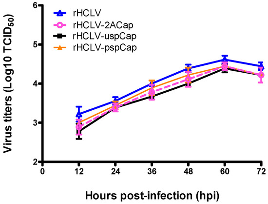 The growth characteristics of rHCLV-2ACap, rHCLV-uspCap, and rHCLV-pspCap were analyzed relative to the parental virus rHCLV. The growth curves of the recombinant viruses exhibited no significant differences from that of the rHCLV (Figure 4), indicating that the insertion of the Cap gene does not affect the viral growth.