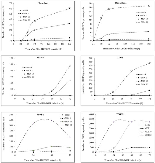 We first determined whether H-1PV could enter mesenchymal cells and express its viral genes. For this, cultures of a panel of cells were inoculated with a recombinant replication-deficient H-1PV-based vector expressing EGFP (Chi-hH1/EGFP). To investigate whether parvovirus infection of mesenchymal cells depended on the transformation status of the cells or on an osteogenic-lineage-specific differentiation pattern, viral infectivity was compared in primary human osteoblasts, non-transformed neonatal foreskin fibroblasts, and three osteosarcoma cell lines. The neuroblastoma cell line WAC-2, a SH-EP subclone stably transfected with the MYCN gene, was used as a positive control [39]. Cells were infected with Chi-hH1/EGFP at an MOI of 0, 1, 10, or 50 replication units (RU) per cell, and EGFP-positive cells were counted manually under a fluorescence microscope at 24-h intervals for 3 days after infection (Figure 1). In the case of primary osteoblasts and fibroblasts, the observation period was extended to 192 h post-infection (Figure 1), as these non-transformed mesenchymal cells displayed no relevant cytopathic effect over this timespan. In each cell culture the intensity of the fluorescence increased over time in the infected cells. The higher the efficacy of viral entry and transduction was, the earlier this maximum level of EGFP expression has been reached.
