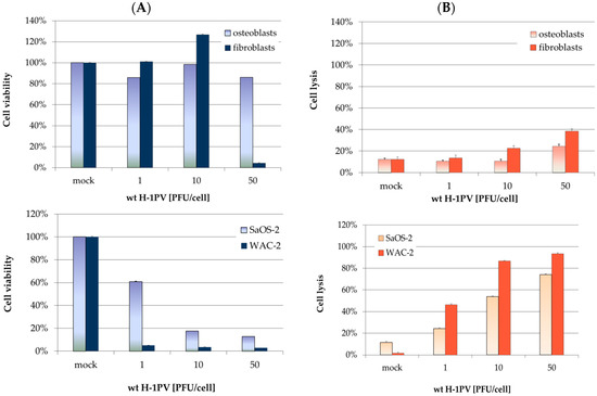 Innocuousness of wild-type H-1PV towards non-transformed mesenchymal cells. (A) 3-(4,5-dimethylthiazol-2-yl)-2,5-diphenyltetrazolium bromide (MTT) test for cell viability quantification, performed 7 days after H-1PV infection. Metabolic activity values were normalized to mock-treated control cells. Bars represent means of eight independent experiments, and the corresponding error bars represent standard errors of the mean (SEM); (B) lactate dehydrogenase (LDH)-release assays for quantifying H-1PV-induced cell lysis. LDH release was assayed three days after H-1PV infection. LDH activity in supernatants was normalized with respect to complete lysis with Triton. SaOS-2 and WAC-2 (lower panel) were used as positive controls.