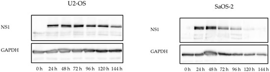 Western blotting was performed as described [37]. The cells, 12 h after seeding, were either mock-infected or exposed to wild-type H-1PV (MOI: 1 PFU/cell). Osteosarcoma cells were harvested at 24-h intervals over a 5-day period post-infection. Briefly, approximately 106 mock- or H-1PV-infected cells were harvested at the time points indicated, collected by centrifugation, and washed with phosphate-buffered saline (PBS). Cell pellets were kept on ice for 1 h in RIPA lysis buffer with freshly added protease inhibitor (complete Mini, EDTA-free, Roche Diagnostics, Indianapolis, IN, USA) and then centrifuged at 15,000× g for 10 min at 4 °C. The supernatants were stored at −80 °C until further analysis. Protein concentrations of the cell lysates were determined photometrically with the PierceTM BCA Protein Assay Kit (Thermo Fisher Scientific, Waltham, MA, USA), according to the manufacturer’s protocol. Twenty micrograms of each cell lysate was resolved by 10% sodium dodecyl sulfate polyacrylamide gel electrophoresis (SDS-PAGE) and transferred to a nitrocellulose membrane (Schleicher & Schüll, Kassel, Germany).