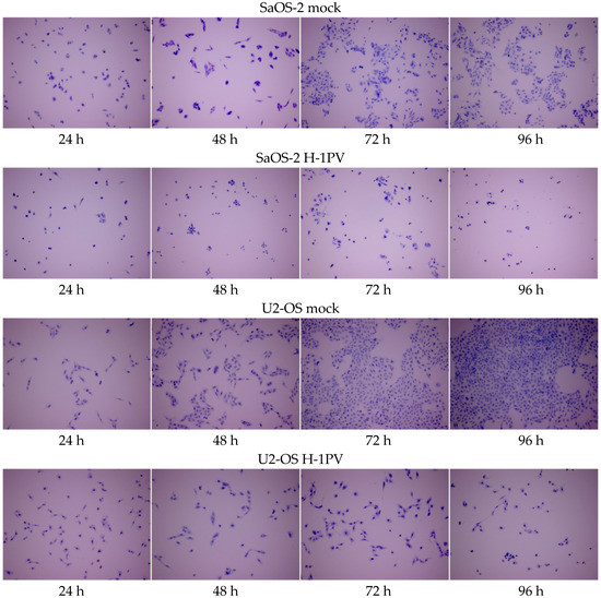Virus-induced cytopathic effects (CPE) on osteosarcoma cells were visualized by crystal violet staining of the cells at different time points after H-1PV infection. They were observed in all established osteosarcoma cell lines, and the number of cells affected increased over time. In CAL-72, H-OS, SaOS-2, and U2-OS cells, H-1PV-induced cytomorphological changes appeared 48 h after infection. In all osteosarcoma cell lines, H-1PV infection reduced cell proliferation and induced significant cell death, as shown for SaOS-2 and U2-OS (Figure 4) and as documented in Figure S2 for the CAL72, H-OS, and MG-63 cell lines. In MG-63 cells, the onset of virus-induced CPE became obvious 72 h after infection.