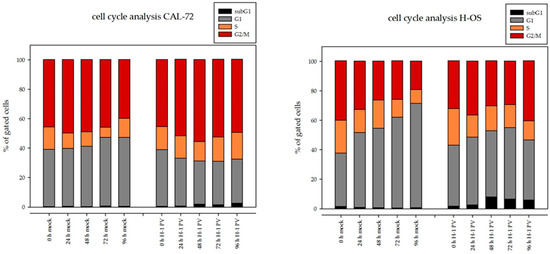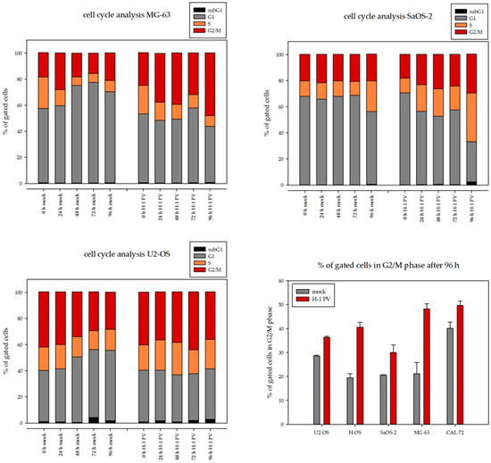 Flow cytometric analyses revealed, 96 h after H-1PV infection, a significant (10–25%) decrease in cells in G1 in all osteosarcoma cell lines tested. Simultaneously, a significantly higher proportion of cells in G2/M (10–30%) were observed in each cell line, as compared to mock-infected cells. H-1PV infection did not increase the percentage of apoptotic cells (subG1 fraction) in the osteosarcoma cell lines analyzed. The capacity of the H-1PV NS1 protein to disrupt the cell cycle has been described in an NS1-inducible stable HEK293-derived cell line [40]. We next investigated the effects of prolonged NS1 expression on the cell cycle distribution of osteosarcoma cells. After infection, cells were collected at 24-h intervals over a 96-h period, as described for the western blot analysis. Cell cycle analyses were performed at each time point. Percentages of cells in the different phases of the cell cycle are represented in Figure 5.