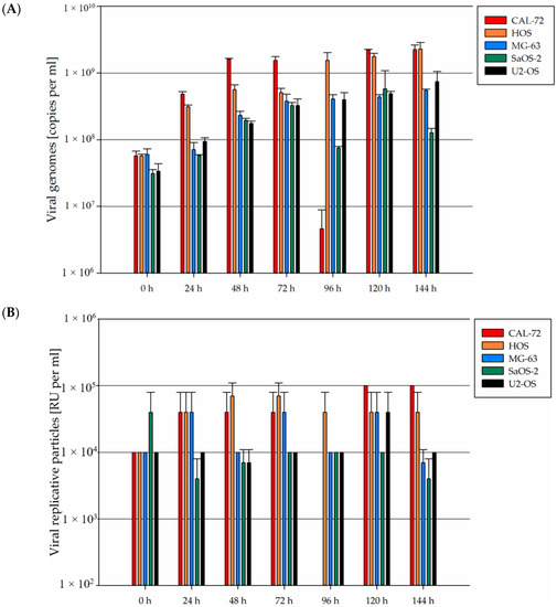 Compared to the input virus remaining in the cell culture medium (0 h), the number of viral DNA copies increased 5- to 10-fold in all five osteosarcoma cell lines, as determined by quantitative PCR (Figure 6, upper panel). Accordingly, the titer of full infectious viral particles did not increase by more than one log-step over the 144 h following infection in any of the five osteosarcoma cell lines tested (Figure 6, lower panel).