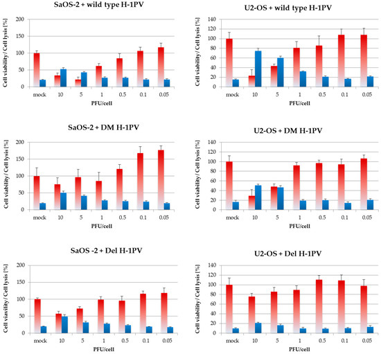 Six days after infection, wild-type H-1PV shows stronger toxicity towards osteosarcoma cells than mutant viruses. Cells were infected with increasing titers of wild-type H-1PV, Del H-1PV, or double-mutant H1-DM. Six days after infection, cytotoxicity testing was performed in 96-well plates in simultaneous MTT tests and LDH-release assays. Red and blue bars represent means of eight independent experiments and error bars represent standard errors of the mean (SEM). Cell viability is indicated in blue and cell lysis in red.