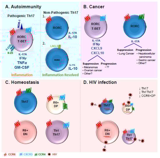The Th17 lineage heterogeneity during homeostasis and disease pathogenesis. This figure summarizes the heterogeneity of Th17 cells as discovered in mice and/or humans. (A) The concept of pathogenic versus non-pathogenic Th17 cells was originally established in the context of autoimmunity. Pathogenic Th17 cells are characterized by their ability to produce pro-inflammatory cytokines such as IL-17A, TNF-α, GM-CSF, and IFN-γ. These cells are identified as Th1Th17 or Th1* cells. They express on their surface the drug efflux pump MDR-1 and the receptor for IL-23, a cytokine found to promote pathogenic Th17 cell features. At the opposite, non-pathogenic Th17 cells are characterized by their ability to produce the immune-suppressive cytokine IL-10 or to express LAG-3; (B) the long-lived properties of certain Th17 subsets raised their potential contribution to cancer progression. However, the role of Th17 cells remains controversial and appears to vary from beneficial to deleterious depending on the type of cancer. Future studies are required to clarify these differences; (C,D) in humans, four subsets of CCR6+ Th17 cells were identified by our group based on their differential expression of CCR4 and CXCR3, as follows: CCR4+CXCR3− (Th17), CCR4−CXCR3+ (Th1 Th17 or Th1*), CCR4−CXCR3− (double negative, CCR6+DN), and CCR4+CXCR3+ (double positive, CCR6+DP). In HIV-uninfected individuals (C), Th17, Th1Th17, and CCR6+DN subsets are present in the blood at similar frequency, whereas CCR6+DP cells are less predominant. In chronically HIV-infected individuals receiving viral suppressive antiretroviral therapy (ART) (D), the frequency of Th17, Th1Th17, and CCR6+DP is dramatically decreased. However, the frequency of CCR6+DN cells is preserved in the blood and this subset is the most predominant in the lymph nodes of ART-treated individuals.