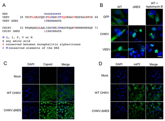 Identification of the CHIKV capsid protein minimal nuclear export sequence. (A) Amino acid sequence alignment of CHIKV capsid putative nuclear export sequence against VEEV capsid; (B) BHK-21 cells were transfected with pEGFP, pEGFP-CHIKV capsid, pEGFP-VEEV capsid (in the presence or absence of Leptomycin B), pEGFP-CHIKV capsid-∆NES, or pEGFP-VEEV capsid-∆NES. After 24 h, cells were treated with Leptomycin B for 30 min at 37 °C prior to fixing, and EGFP fluorescence was analyzed by direct visualization. The white bar represents 10 µm; (C,D) BHK-21 cells were infected with WT CHIKV or CHIKV ΔNES. After 24 h cells were fixed, permeabilized, and capsid protein (C) and nsP2 (D) localization were analysed by indirect immunofluorescence using anti-CHIKV capsid and anti-nsP2 antibodies. Images are representative of three independent experiments and at least six fields of view. The white bar represents 25 µm.