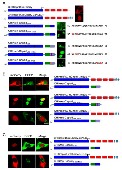 Functional CHIKV capsid protein NES is required for nuclear import. (A) BHK-21 cells were electroporated with CHIKV replicons (solid blue) encoding four mCherry proteins (CHIKrep/4X mCherry) (solid red) or four mCherry proteins plus three copies of the SV40 nuclear localization signal (CHIKrep/4X mCherry-3xNLS) (solid light blue) under control of subgenomic promoter, together with either; (B) EGFP-VEEV capsid (hatched blue), EGFP-VEEV ΔNES capsid (mauve bar) or EGFP-VEEV ΔNLS capsid (orange bar), or (C) EGFP-CHIKV capsid, EGFP-CHIKV ΔNES capsid. Cells were fixed after 24 h and EGFP and mCherry fluorescence analyzed by direct visualization. Images are representative of three independent experiments and at least six fields of view. The white bars represent 15 µm.