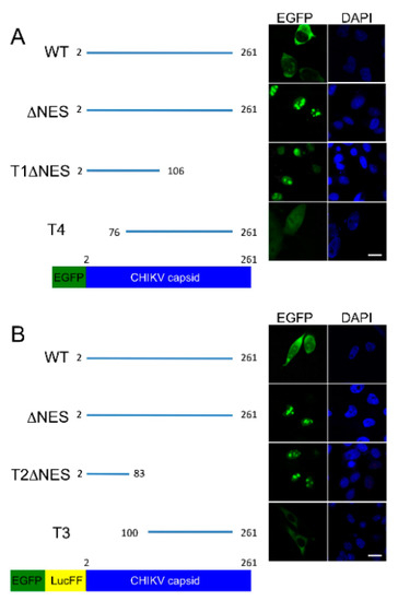 In the above studies, EGFP fused to the N-terminus of CHIKV capsid protein was used to demonstrate active transport of CHIKV capsid to the nucleus and capsid protein was present in both the cytoplasm and nucleus of BHK-21 cells (Figure 2A,C). The same was observed in HeLa cells. In the nucleus, capsid protein accumulated in foci reminiscent of the nucleolus. This was particularly apparent with capsid protein lacking a nuclear export sequence (∆NES) (Figure 2C). To further investigate the subcellular localization of capsid protein, truncated mutants (T1, T2, T3, and T4) lacking portions of the N or C terminus of capsid protein were constructed and their subcellular localization analyzed.