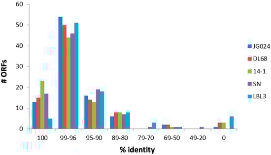 Phage SL4 possesses 4–11 ORFs with 100% identity at protein level with ORFs of those phages shown in Figure 4. The majority (28–36 ORFs) show sequence identities between 96% and 99%, followed by 8–14 ORFs with sequence identities between 90% and 95% at protein level (Figure 4).