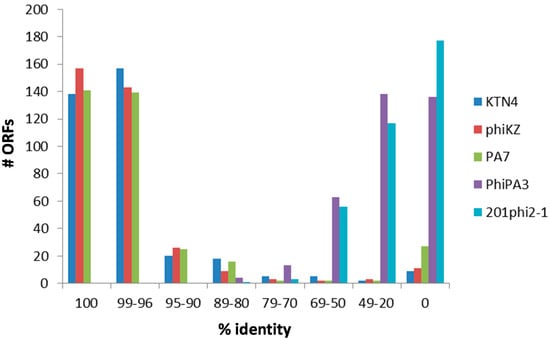 Sequence identity of translated ORFs of phage SL2 with five members of the phiKZ-like viruses (i.e., phages KTN4, phiKZ, PA7, PhiPA3, and 201phi2-1).