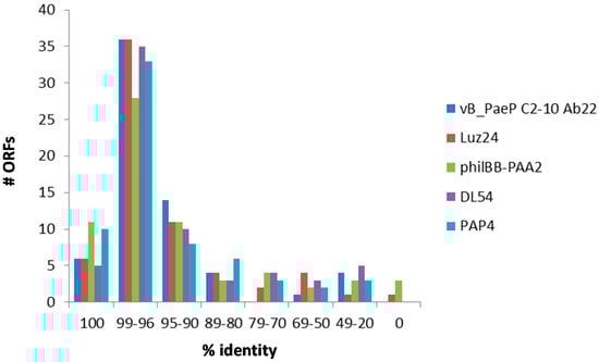 Sequence identity of translated ORFs of phage SL4 with five members of the LUZ24-like viruses (i.e., phages vB_PaeP C2-10 Ab22, Luz24, philBB-PAA2, DL54, and PAP4).