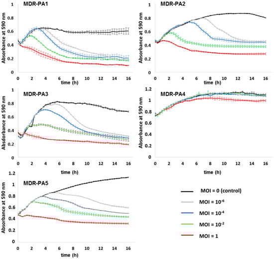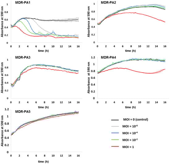 Phage SL4 suppressed MDR-PA1 at a MOI of 1 and 10−2, but higher phage dilutions had no suppressing effect on this bacterial strain (Figure 7). Strains MDR-PA2, MDR-PA3 and MDR-PA5 were suppressed by phage SL4 at MOI 1 (Figure 7), although not as efficiently as phage SL2 (Figure 6). Interestingly, SL4 did not suppress the growth of its host strain MDR-PA4 at all MOIs tested.