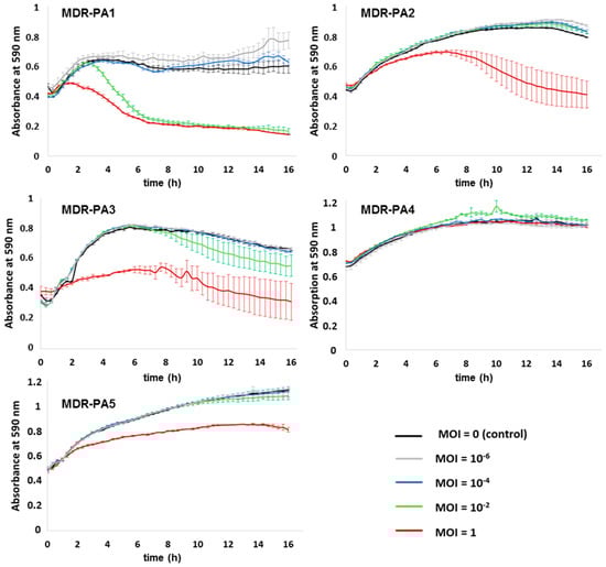 The efficacy of the three phages alone and as a cocktail was assessed by incubating the strains MDR-PA1-5 in liquid medium with single phages or in combination for 16 h using four different MOIs (i.e., MOI of 1, 10−2, 10−4, and 10−6, respectively). Phage SL1 was able to suppress the growth of its host strain MDR-PA1 at all MOIs, with the highest phage dilution initiating the decline after about 5 h of bacterial growth (Figure 5).