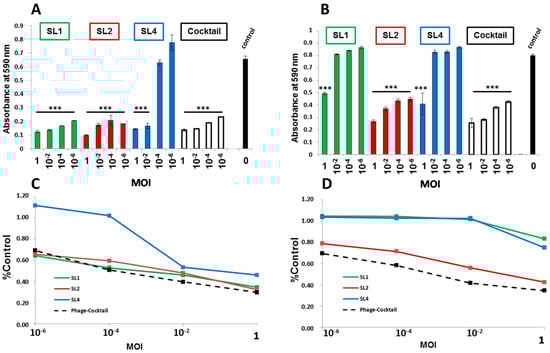 Reduction of multi-drug resistant P. aeruginosa strains: MDR-PA1 (A,C); and MDR-PA2 (B,D) in liquid medium after 16 h treatment with phages SL1, SL2, and SL4 in liquid culture using four different MOIs. (A,B) OD590-values after 16 h incubation with phage; and (C,D) area under the curves divided by the area under the curve of the control; Each experiment was performed in triplicate and the means ± standard errors are indicated. Statistical significance of bacterial reduction (compared to the control) was assessed by performing Student’s t-test. p-Values refer to the control: *** p < 0.001, ** p < 0.01, * p < 0.05.