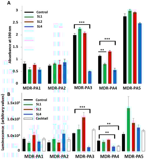 Reduction of 24 h-old biofilms of multi-drug resistant P. aeruginosa strains (MDR-PA1-5) by phages SL1, SL2, and SL4 and a cocktail with all three phages (phage incubation for 3 h, MOI 100): (A) Crystal violet assay; and (B) ATP-dependent luminescence assay. Each experiment was performed in triplicate and the means ± standard errors are indicated. Statistical significance of biofilm reduction was assessed by performing Student’s t-test. Note that the effect of the cocktail was only evaluated with the method in (B). p-Values: *** p < 0.001, ** p < 0.01, * p < 0.05.