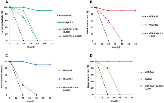 Percent Survival rate of larvae of Galleria mellonella after infection with multi-drug resistant P. aeruginosa strains (MDR-PA1, MDR-PA2 and MDR-PA4) and treatment with phages SL1 (A), SL2 (B), SL4 (C) or all phages together as a cocktail (D) 1 h post-infection. Numbers indicate MOI).