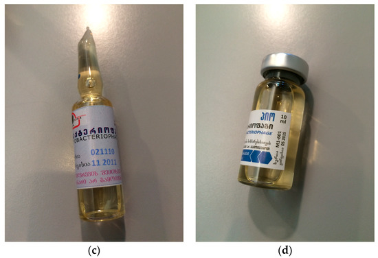 The four batches of pyophage (PYO) cocktail investigated here. The glass ampoules are dated (a) 1997; (b) 2000; (c) 2010 and (d) 2014.