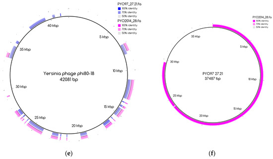 The number of draft genomes belonging to each category does not necessarily match between the two samples, even for the categories of draft genomes with a counterpart in the other sample, categories 1 and 3. This is, for instance, the case for draft genome PYO97_29, category 1, mapping to the collapsed draft genome PYO2014_21, which belongs to the fifth category, Figure A1. Table 8 and Table 9 provide a general overview of the phage draft genomes found in PYO97 and PYO2014, respectively, together with an indication of the most likely taxonomic group they belong to. For a more thorough description of the draft genomes in each category, see Tables S2 and S3 for PYO97 and PYO2014, respectively. A case worth noticing is that of the draft genomes PYO97_27.21 and PYO2014_28 in category 3. These draft genomes share similarity with ANI > 70%, but have low ANI to the common reference genome, Yersinia phage phi80-18 (refer to, Figure 3e,f for an illustration of the overlap between the two bins). This could suggest that the PYO97_27.21 and PYO2014_28 draft genomes represent a previously uncharacterized phage.