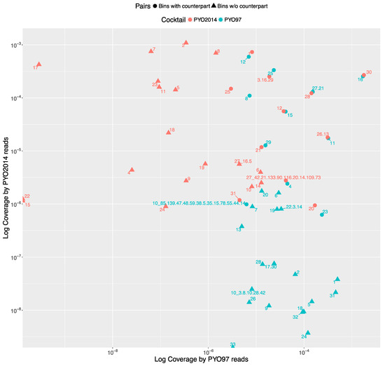 All the bins from PYO97 and PYO2014 are plotted according to the Log to base 10 of the coverage by PYO97’s reads, x-axis and PYO2014’s reads, y-axis. Bins from PYO97 are depicted in blue, whilst bins from PYO2014 are red. Circle shaped data points represent pairing bins between the two samples, i.e., bins for which MetaPhinder found a matching counterpart in the other sample with a ANI > 70%; see Table 6 and Material and Methods, Estimate similarities between PYO97 and PYO2014.