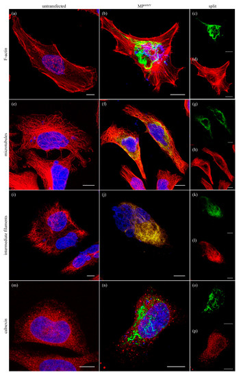 The MPAbMV:EYFP accumulation patterns led to the assumption that MPAbMV interacted with or re-organized a component of the cytoskeleton. Therefore, MPAbMV-expressing HeLa cells were fixed and either co-stained with rhodamine-phalloidin to visualize F-actin filaments (Figure 3a–d) or treated with antibodies against β-tubulin (Figure 3e–h), α-vimentin (Figure 3i–l), or calnexin (Figure 3m–p) for visualization of MT, intermediate filaments (IF), or endoplasmic reticulum (ER), respectively. The F-actin filaments and ER network were virtually unaltered upon MP accumulation (Figure 3b–d,n–p) and did not colocalize with MPAbMV. In contrast, MPAbMV was detected at the MT cytoskeleton and the IF (Figure 3f–h,j–l), compared to the MP-untransfected control cells. The association of MPAbMV to the MT appeared to induce bundling of the MT, since the control cells devoid of MPAbMV exhibited a normal radial microtubule organization consisting of MT that extended from the centrosomal region close to the nucleus toward the cell periphery (Figure 3e), and evenly distributed IF (Figure 3i).