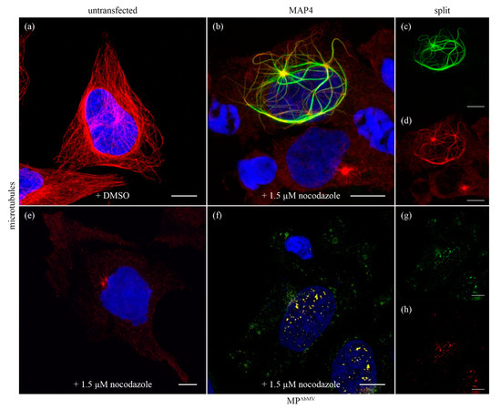 MPAbMV-expressing HeLa cells were treated with nocodazole, a drug interfering with the dynamic tubulin polymerization, to investigate whether MPAbMV might not only act as a MT bundling agent, but potentially even as a microtubule-stabilizing protein. Under the conditions applied, nocodazole-treated cells displayed disruption of the microtubules network (Figure 4e) compared to the control cells (Figure 4a). Two remaining small dots brightly labelled by β-tubulin-specific immunostaining most likely represented the MTOCs. Expression of the microtubule-binding domain of the MAP4, fused to dsRed, stabilized the network against nocodazole treatment, as expected (Figure 4b–d). In contrast, MPAbMV could not maintain the filamentous structures in nocodazole-treated cells, but accumulated with β-tubulin in aggregates (Figure 4f–h).