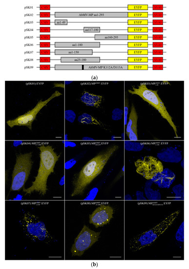 HeLa cells were then transiently transfected with a series of expression clones, encoding MPAbMV:EYFP deletion mutants, to determine which domains of MPAbMV are necessary and sufficient for its capacity to maintain the localization phenotype of the wild-type protein. Figure 5a shows the domains of MPAbMV and the set of constructs created to express MPAbMV:EYFP deletion mutants, which were chosen according to previously described domains in Zhang et al. [46], Frischmuth et al. [14], and Krenz et al. [10]. These are the MP pilot domains from amino acids (aa) 1–49 (pSK03), the anchor domain from aa 117–180 (pSK04), and the oligomerization domain from aa 160–293 (pSK05). After expression in the mammalian cells, all four mutants did neither colocalize with the MT network nor induce MT bundling, but behaved such as free EYFP (pSK01). An exception represented the fourth constructed domain from aa 1–180 (pSK06); this mutant exhibited the same phenotype as the wild-type MPAbMV:EYFP (pSK02) (Figure 5b). Hence, this putative domain is named “association domain” in the following. To narrow down the minimal “association domain”, mutant constructs were generated with truncated N- or C-termini of this domain. The cropped mutants of this part did not reveal the filamentous structure (pSK07 + pSK08), leading to the assumption that the minimal association domain spans from aa 1–180. In addition, an amino acid substitution mutant was created (pSK09) according to Sanderfoot and Lazarowitz [38]. The MPAbMVK112A/D113A:EYFP mutant showed punctuated aggregations at the cell periphery in HeLa cells (pSK09).
