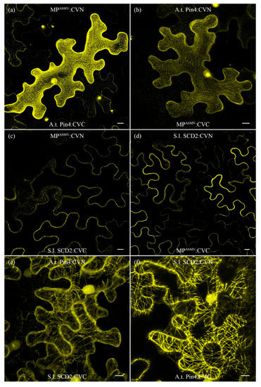 Bimolecular fluorescence complementation of (a) MP:YFPN with A.t.Pin4:YFPC (PIN4 = peptidyl-prolyl cis-trans isomerase NIMA-interacting 4); (b) A.t.Pin4:YFPN and MP:YFPC; (c) MP:YFPN + S.l.SCD2:YFPC (SCD2 = stomatal cytokinesis defective protein 2); (d) S.l.SCD2:YFPN + MP:YFPC; (e) A.t.Pin4:YFPN + S.l.SCD2:YFPC; and (f) S.l.SCD2:YFPN + A.t.Pin4:YFPC in epidermal cells of N. benthamiana plants. Bimolecular fluorescence complementation (BiFC) signals in yellow. Bar represents 10 µm.