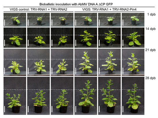 Double inoculation of tobacco rattle virus (TRV) (left) or the TRV-Pin4 silencing system (right) and AbMV DNA A ∆CP GFP. Bioballistic inoculation was performed 7 days after TRV agro-inoculation. Plants were monitored 1 day post bombardment (dpb), 14 dpb, 21 dpb, and 28 dpb. Plants not silenced for Pin4 are more stunted. Bar represents 20 cm. VIGS = virus-induced gene silencing.