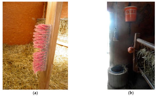 Epidemiological investigations on cowpox virus (CPXV) infection in four alpaca herds in Eastern Germany: (a) a broom for grooming, situated in the stable of flock 1 (herd III), tested positive for CPXV-specific DNA by swab sample; (b) the water bucket (black) in the stable of flock 3 (herd III), where a dead common vole (Microtus arvalis), positive for CPXV-specific DNA, was found.
