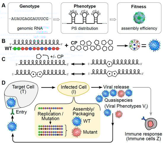 - The assembly step is simulated by giving each positive-sense vRNA created in the replication step the chance to package based on its phenotype and the associated probability of packaging obtained from our pre-computed phenotype-fitness map. Mimicking in vivo scenarios, our PS-mediated assembly model simulates ssRNA virus assembly against a backdrop of cRNAs. The latter are associated with a uniformly small chance of packaging. Successfully encapsidated cRNAs act as immunogens in our model, stimulating the immune response, as they are indistinguishable from viral particles at the particle exterior. However, although cRNAs are allowed to enter target cells, they do not result in the production of additional viral particles. Following the assembly step, progeny vRNAs and misencapsidated cRNAs that are fully encapsidated are released into the extracellular environment and are added to the total viral load.