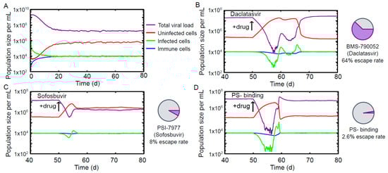 The time course of a chronic infection based on data for Hepatitis C virus. (A) Time evolution of viral load, host, infected and immune cells in the drug-free case. 20 days after the initial infection, the population sizes have reached a stable equilibrium corresponding to a viral load of 107/mL. Typical time courses for viral quasispecies that have developed resistance to Daclatasvir (B); Sofosbuvir (C); and a PS-binding assembly-inhibitor (D). The probability of the quasispecies developing therapy resistance is significantly lower for the PS-binding drug. At the drug concentration for which infection of a single cell with the wild-type sequence results in the same number of viral particles at cell burst under treatment with Sofosbuvir and the PS-binding drug (8.07 µM); the drug escape for the PS-binding drug is 2.6%, compared with 8% for Sofosbuvir. A similar comparison with Daclatasvir using a PS-binding drug concentration of 10.30 µM results in a drug escape rate of 1.7% for the PS-binding drug (not shown), compared with 64% for Daclatasvir.