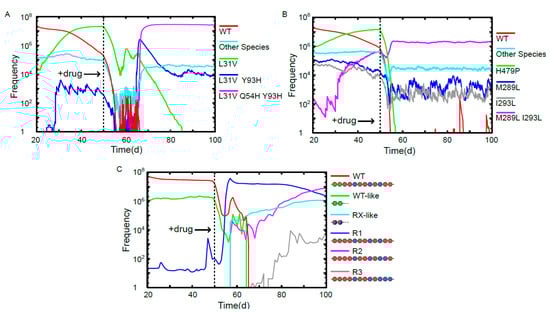 Evolutionary trajectories of vRNAs in the viral quasispecies in a drug escape scenario. (A) Time evolution of vRNAs in the viral quasispecies under the conditions of a chronic infection and exposure to Daclatasvir at day 50. WT and mutants L31V, L31V Y93H, L31V Q54H Y93H are shown on an individual basis, and all other species are grouped together. L31V is on the pathway to the therapy-resistant triple mutant L31V Q54H Y93H, which is the dominant species from day 66; (B) time evolution of vRNAs in the viral quasispecies under a chronic infection treated with Sofosbuvir at day 50. WT, H479P, M289L, I293L and M289L I293L are shown on an individual basis, and all other species are grouped together. At day 50, the single mutant H479P is dominant, but has poor drug resistance, and is displaced as the dominant vRNA by the more resistant double mutant M289L I293L after day 55; (C) the time evolution of vRNAs in the viral quasispecies under chronic infection conditions and exposure to a PS-binding assembly-inhibitor at day 50. WT and the three emergent therapy-resistant vRNAs R1, R2 & R3 are shown individually, while WT-like vRNAs (characterised by having two high-affinity PSs at the 5’ end as in the WT) and R1/2/3-like vRNAs (containing only intermediate and low affinity PSs) are shown as groups. The dominant species following drug exposure is R1, which is then displaced by R2 after day 87. The sequence R3 is present at low frequencies at day 100, but becomes the dominant species from day 190.
