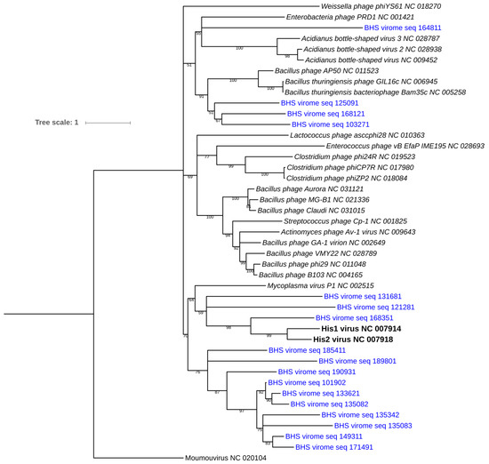 Maximum-likelihood phylogram of the viral polymerase B protein domain. Bootstrap confidence values are expressed in % and are indicated along the branch lengths. Branches with support values lower than 50% were collapsed. Phylogenetic distance is denoted by branch length (to scale) and is indicated in the legend. The Moumou virus (an algal virus) was placed at the bottom of the tree as an outgroup. PolB sequences from the BHS dataset are highlighted in blue and denoted as “BHS virome seq (sequence ID)’. His1 and His2 PolB sequences are shown in bold. All NCBI accession numbers for the reference isolate sequences are indicated after the strain denomination.