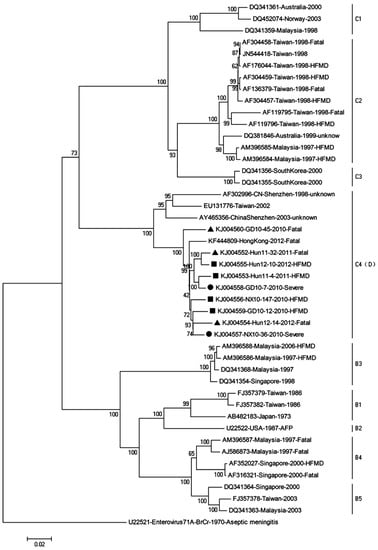 - Yip, C.C.; Lau, S.K.; Lo, J.Y.; Chan, K.H.; Woo, P.C.; Yuen, K.Y. Genetic characterization of EV71 isolates from 2004 to 2010 reveals predominance and persistent circulation of the newly proposed genotype D and recent emergence of a distinct lineage of subgenotype C2 in Hong Kong. Virol. J. 2013, 10, 222. [Google Scholar] [CrossRef] [PubMed]