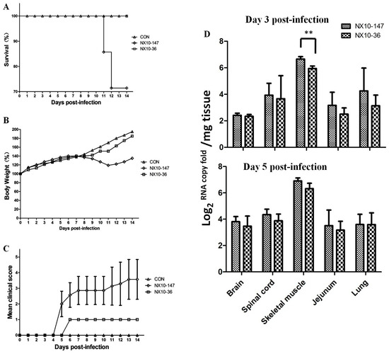 - Xu, Y.; Ma, S.; Zhu, L.; Huang, Z.; Chen, L.; Yin, H.; Peng, T.; Wang, Y. Clinically isolated enterovirus A71 subgenogroup C4 strain with lethal pathogenicity in 14-day-old mice and the application as an EV-A71 mouse infection model. Antivir. Res. 2017, 137, 67–75. [Google Scholar] [CrossRef] [PubMed]