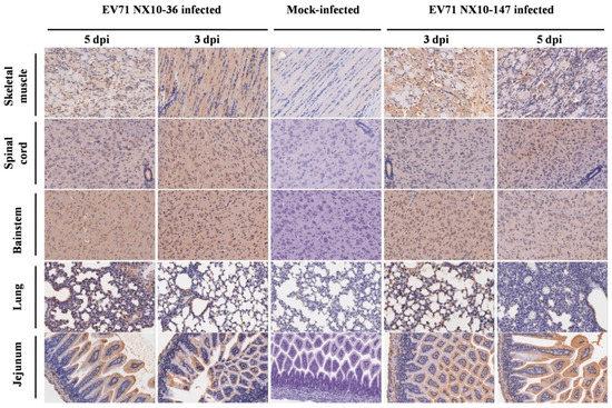 - Hsueh, C.; Jung, S.M.; Shih, S.R.; Kuo, T.T.; Shieh, W.J.; Zaki, S.; Lin, T.Y.; Chang, L.Y.; Ning, H.C.; Yen, D.C. Acute encephalomyelitis during an outbreak of enterovirus type 71 infection in Taiwan: Report of an autopsy case with pathologic, immunofluorescence, and molecular studies. Mod. Pathol. 2000, 13, 1200–1205. [Google Scholar] [CrossRef] [PubMed]
