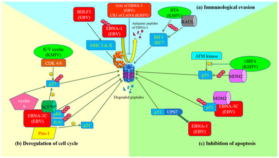 Schematic diagram of exploitation of ubiquitin-proteasome system by gamma-herpesviruses and the development of cancer hallmarks. (a) Immunological evasion: GAr domain of Epstein-Barr virus (EBV) nuclear antigen (EBNA)-1 or Kaposi’s sarcoma-associated herpesvirus (KSHV) central repeat (CR)1 of latency-associated nuclear antigen (LANA)inhibits proteasome so as to prevent the proteolysis of EBNA-1 and the production of its antigenic peptides for major histocompatibility complex (MHC) class I presentation. BDLF3 promotes internalization and proteasomal degradation of MHC molecules. As a result, cytotoxic T lymphocytes (CTLs) are not able to detect and kill the latent viruses-infected cells. Replication and transcription activator (RTA) (KSHV) itself or through stabilization of RTA-associated ubiquitin ligase (RAUL) facilitates the ubiquitination and proteasomal degradation of interferon regulatory factor (IRF)3 and IRF7, which are important for innate immunity; (b) Deregulation of cell cycle: EBNA-3C can stably interact with pRb and recruit SKP1-Cul1-F-box protein (SCF)Skp2 E3-ubiquitin ligase to promote degradation of pRb. Thus, E2F is released and activates the transcription of cyclin-dependent kinases for cell cycle progression. Moreover, EBNA-3C also physically interacts with and degrades Bcl-6 through ubiquitin-specific protease (UPS) but the ligase that facilitates the ubiquitination is still under investigation. EBNA-3C interacts with Pim-1 which enhances the phosphorylation of p21WAF1 and promotes proteasomal degradation of p21WAF1. The association of SCFSkp2 with EBNA-3C or cyclin-dependent kinase (CDK)4/6 with K/V cyclin (KSHV) increases phosphorylation and proteasomal degradation of p27KIP1. Additionally, stabilization of cyclin A by EBNA-3C also promotes degradation of p27KIP1 through UPS. In summary, gamma-herpesviruses possess multiple mechanisms to assist the infected cells to bypass cell cycle checkpoints for proliferation; (c) Inhibition of apoptosis: EBNA-1 displaces p53 in the interaction with ubiquitin-specific protease 7 (USP7), resulting in destabilization of p53 and its degradation by proteasome. On the other hand, MDM2 E3-ubiquitin ligase is recruited and stabilized by EBNA-3C or vIRF4 (KSHV), leading to ubiquitination and proteasomal degradation of p53. Viral interferon regulatory factor (vIRF)4 also inhibits the phosphorylation of p53 by ataxia-telangiectasia mutated (ATM) kinase upon DNA damage response, causing destabilization and proteasomal degradation of p53.