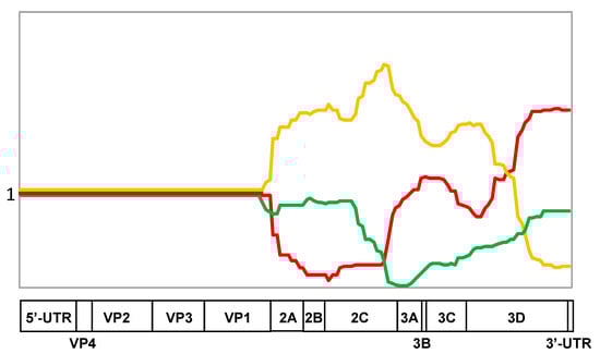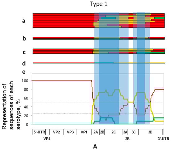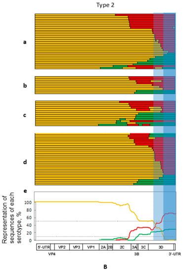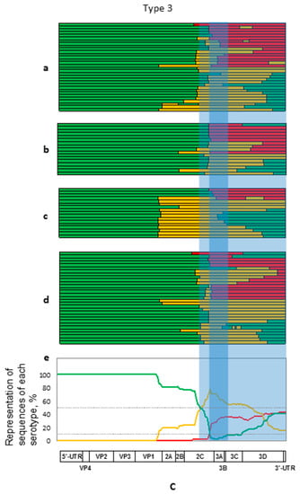Thus, the presence of homotypic 5′- and 3′-adjacent sequences in the type 1 recombinants (Figure 1A) could be hypothetically due to their preferred mutual compatibility (epistasis) but, as demonstrated in Figure 2, this 3′-terminal sequence was evidently good for all serotypes, suggesting that it may possess intrinsically higher fitness. Similarly, some other distinct portions of each serotype appeared to exhibit either relatively high (a significant part of the serotype type 2 sequences encoding nonstructural proteins, especially a 3′-proximal region of the 2C gene) or low preference (serotype 2 3′-terminus and serotype 3 sequence around the border between the P2 and P3 regions) irrespective of the nature of capsid proteins. Thus, the relative intrinsic weakness/strength of distinct genomic segments appeared to play a significant role in their loss/acquisition by recombination, though effects of epistatic interactions could not be discounted as well.