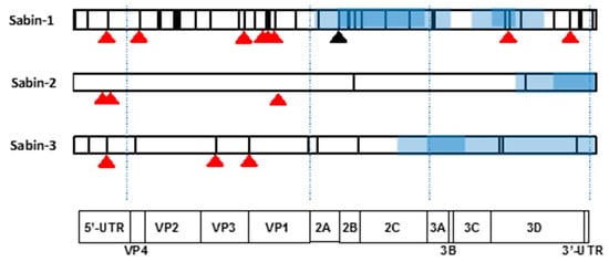Location of known attenuating mutations (red triangles), an often-reverted serotype-1-specific mutation (black triangle) and mutations acquired upon the derivation of vaccine strains (vertical lines) in the genomes of Sabin viruses. Regions speculated to determine a decreased fitness are highlighted as blue rectangles. Their darker and lighter shading refer to the proposed “weak” and “provisionally weak” genomic areas (see Figure 1). The schematic representation of poliovirus genome and its functional elements are given at the bottom.