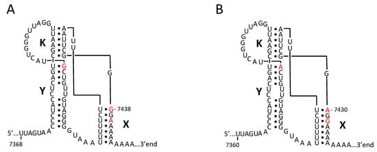 Schematic representation of the possible 3′-terminal tertiary structures of the RNAs of Sabin-2 (A) and Sabin-3 (B) polioviruses. It shows the helical elements of hairpins X and Y as well as the tertiary kissing interaction between these hairpins (K). The nucleotides distinguishing these two 3′UTRs are highlighted in red. Of note, these distinctive nucleotides in Sabin 1 RNA are the same as in Sabin 3. Modified from [35].