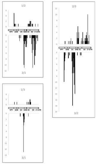 As judged by the level of divergence of the recombinant’s capsid protein VP1-coding sequences from those of their vaccine parents, recombination generally occurred early in the evolution of the vaccine strains. Indeed, out of 107 genomes investigated in this respect, 87 could be classified, by using official criteria [24], as Sabin-like, i.e., “young” viruses (Table 1). On the other hand, there were several examples, when the “ages” of segments of a given virus originating from different parents appeared to markedly differ, suggesting the possibility of late recombination as well. Thus, the multipartite recombinant 13688 (Table S1) of structure S1-S3-S2-S1-S2-S3, having only 2 replacements (0.05%) in the proximal 3840 nucleotides derived from serotype 1, exhibited 2.2%, 1.3%, 4%, 0.8%, and 1.2% mutations in the successive segments, respectively.