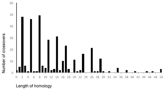 The dependence of the frequency of crossovers on the length of homologous sequences in the relevant regions of the recombining partners. Peaks corresponding to homology lengths of 2, 5, 8, etc. are caused by the fact that the most often difference between sequences of 3 serotypes concerns the third positions of the codons.