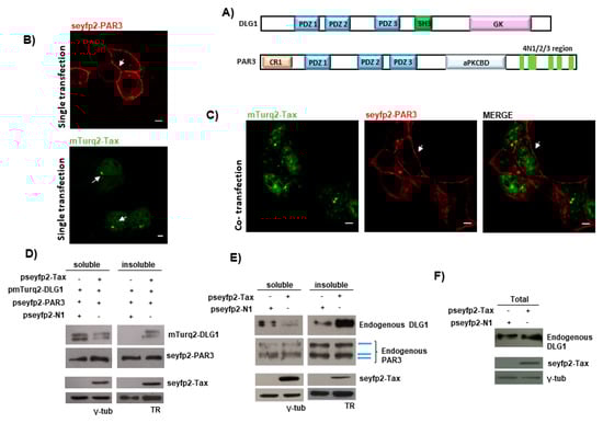 The DLG1-Tax co-localization pattern does not arise from an overabundance of PDZ domains inside the cell. (A) Schematic representation of DLG1 and PAR3 proteins, showing that both proteins bear three PDZ domains. SH3, interaction domain Src homology 3; GK, homologous to the yeast guanylate kinase enzyme; CR1, oligomerization domain; aPKCBD, atypical protein kinase C binding domain; (B) Subcellular distribution of the PAR3 PDZ-containing protein and Tax in epithelial cells. A plasmid encoding seyfp2 tagged PAR3 or mTurq2 tagged Tax was transfected in HEK293 cells and its expression was analyzed by confocal microscopy (red); (C) Simultaneous overexpression of Tax and PAR3 proteins in epithelial cells. The plasmids encoding seyfp2-PAR3 (red) and mTurq2-Tax proteins (green) were co-transfected in HEK293 cells and co-localization between both proteins was tested. In (B,C), the white arrows indicate the expression of the over-expressed proteins as described in the text. All scale bars are 5 µm; (D) Influence of Tax expression over ectopic DLG1 and PAR3 subcellular distribution. HEK293 cells transfected with pseyfp2-Tax or with the control empty vector pseyfp2-N1 together with the pmTurq2-DLG1 or pseyfp2-PAR3 expressing plasmids were harvested, and detergent soluble and insoluble fractions were separated by centrifugation. The mTurq2-DLG1, seyfp2-PAR3, and seyfp2-Tax expression levels in each fraction were assessed by Western blot using anti-green fluorescent protein (anti-gfp) antibody; (E) Influence of Tax expression over endogenous DLG1 and PAR3 subcellular distribution. HEK293 cells transfected with pseyfp2-Tax or with the control empty vector pseyfp2-N1 were harvested, and detergent soluble and insoluble fractions were separated by centrifugation. Endogenous DLG1 and PAR3 expression levels in each fraction were assessed by Western blot using anti-DLG1 and anti-PAR3 antibodies. The seyfp2-Tax expression was ascertained using an anti-gfp antibody. For (C,D), the γ-tubulin and Transferrin receptor (TR) expression, which were detected with anti-γ-tubulin and anti-TR antibodies, were used as loading control; (F) Influence of Tax expression over DLG1 total levels. HEK293 cells transfected with pseyfp2-Tax or with the control empty vector pseyfp2-N1 were harvested, and total protein extracts were separated by SDS-PAGE. The endogenous DLG1 expression level was assessed by Western blot using anti-DLG1, and seyfp2-Tax expression was ascertained using an anti-gfp antibody.