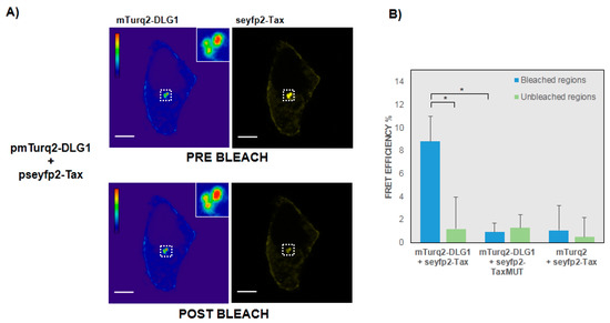 To further confirm this, we verified, for the first time, the direct interaction of DLG1-Tax within the cell. By applying an acceptor photobleaching FRET protocol we were able to establish the closeness of the proteins under study and confirm that the binding takes place within the speckled aggregates in a PDZ-dependent manner.