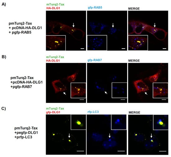 Based on our findings, we hypothesized that a portion of the aggregate forms of Tax-DLG1 observed in the cytoplasm may be taking part in intracellular trafficking pathways. To begin examining this hypothesis, we used the RAB endosome markers: RAB5 (early endosomes) and RAB7 (late endosomes). These small GTPases interact with proteins involved in vesicular transport and protein complexes that regulate vesicle fusion []. Moreover, these proteins are components of the exosomes as they are structures that derive from the invagination of endosomes []. This is worth investigating since recent reports have associated Tax with exosomes and have demonstrated its importance for viral pathogenesis []. Besides, new data suggests that DLG1 may also participate in the intracellular trafficking machinery, recruiting components of the vesicles in both endocytic and exocytic pathways []. Considering this, we performed tripartite co-localization analysis in HEK293 cells co-transfected with pmTurq2-TaxHA-DLG1 and pgfp-RAB5 (Figure 4A) or pgfp-RAB7 (Figure 4B) by confocal fluorescence microscopy. The expression of these endosome markers in HEK293 cells was first evaluated by fluorescence as it can be appreciated in Figure S2. The results presented in Figure 4A,B show, in concordance with the previous results, the DLG1 and Tax dotted co-localization (left panels). However, no co-localization of these complexes with the RAB markers was observed (Figure 4B,C, right panels).