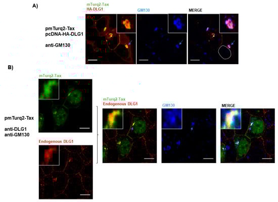 The DLG1-Tax complexes co-distribute with the Golgi apparatus. (A) Evaluation of co-localization of the perinuclear DLG1-Tax complexes with GM130 in overexpression experiments. HEK293 cells transiently transfected with pcDNA-HA-DLG1 and pmTurq2-Tax plasmids were immunostained to detect GM130 expression using a monoclonal anti-GM130 antibody (blue). HA-DLG1 expression was detected using an anti-HA antibody (red) and mTurq2-Tax expression was observed directly through the mTurq2 emission (green). Dashed circles indicate nuclear regions. The DLG1-Tax complexes are shown in yellow; (B) Analysis of co-localization of the endogenous DLG1-Tax complexes with GM130. HEK293 cells were transiently transfected with mTurq2-Tax (green), and endogenous DLG1 (red) and GM130 (Blue) were detected using specific antibodies. In (A,B), the light blue arrow indicates the region which is amplified in the inset, indicating the DLG1-Tax-GM130 triple co-distribution. All scale bars are 10 µm.