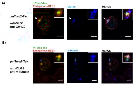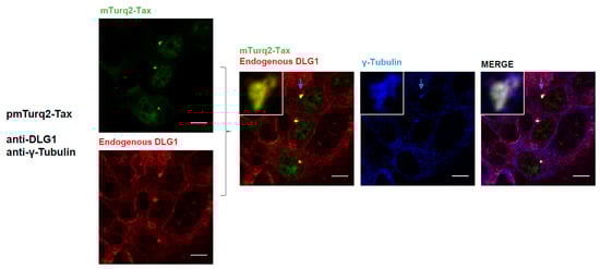 In addition, it was reported that Tax localizes at the microtubule-organizing center (MTOC), a structure closely associated with the cis-Golgi compartment, where the viral protein can regulate the polarization of microtubules to favor the virological synapse along with signal transduction activation [,]. Remarkably, DLG1 expression was detected in mitotic centrosome recruiting factors which facilitate centrosome motility [,]. Then, we evaluated if the Tax-DLG1 aggregates could be associated with MTOC arrangement in the perinuclear region. For this, HEK293 cells transiently transfected with pmTurq2-Tax vector were stained with antibodies directed against DLG1 and γ-tubulin, a component of the MTOC. As it can be appreciated in Figure 6, there is a clear association of the Tax-1-DLG1 complexes with the γ-tubulin marker. This result suggests that part of the protein aggregates close to the nucleus is associated with the MTOC, and their distribution is closely juxtaposed with the Golgi compartment.