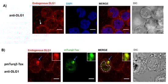 Tax-mediated alteration of DLG1 expression in T-cells. (A) Analysis of DLG1 expression in Jurkat T cells. The expression of endogenous DLG1 indicated with white arrows was assayed by immunfluorescence using an anti-DLG1 antibody (red). The nucleus was stained with 4′,6-diamidino-2-phenylindole (DAPI) (blue); (B) Expression of DLG1 in the presence of Tax. Jurkat T-cells were transfected with pmTurq2-Tax and endogenous DLG1 expression was assayed by IF. The light blue arrows indicate the co-localization region (yellow) which is amplified in the inset. All scale bars represent 5 µm.