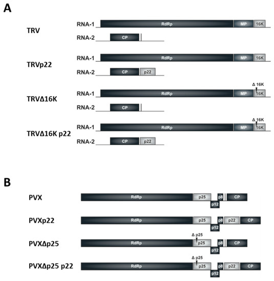 Tobacco rattle virus (TRV, genus Tobravirus, family Virgaviridae) and PVX have been frequently used as viral vectors for both, gene expression and gene silencing studies [18,19,20]. TRV has a bipartite, positive-sense single-stranded RNA in which RNA1 encodes the replicase proteins, the 29K cell-to-cell movement protein [21], recently described as an RNA silencing suppressor [22], and the 16K silencing suppressor protein [23,24,25,26]. TRV RNA2 encodes a coat protein (CP) [27], and it has been engineered to facilitate insertion of heterologous gene sequences [28,29,30,31]. In RNA1, while the replicase is translated from the genomic RNA, the 29K and 16K proteins are translated from the respective subgenomic RNAs (sgRNA) [27]. TRV RNA1 is capable of replicating and moving systemically in plants in the absence of RNA2 [32]. On the other hand, PVX has a monopartite, positive-sense single-stranded RNA genome encoding five open reading frames (ORFs); a first ORF encodes the viral replicase, a central region encodes three overlapping ORFs, known as the triple-gene block (TGB), and a final ORF encodes the CP [33]. It has also been engineered to insert heterologous gene sequences. The three central region-encoded proteins and the final viral CP are translated from sgRNAs. One of the three TGB proteins is the multifunctional P25 that suppresses RNA silencing and is required for cell to cell movement through plasmodesmata [34,35]. It has been shown that although PVX movement is dependent on the suppression function of P25, suppression of silencing is not sufficient to allow virus movement [35].